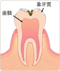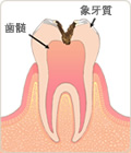 虫歯が象牙質(歯の大部分を構成している組織)にまで達した状態です。